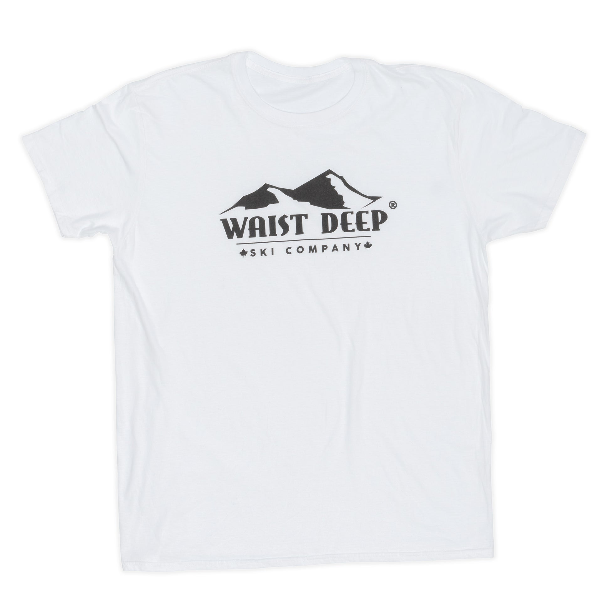 White, unisex, 100% cotton Gildan brand T-shirt, with the Waist Deep logo printed across the front in contrast black. A loose fitting, soft cotton shirt.