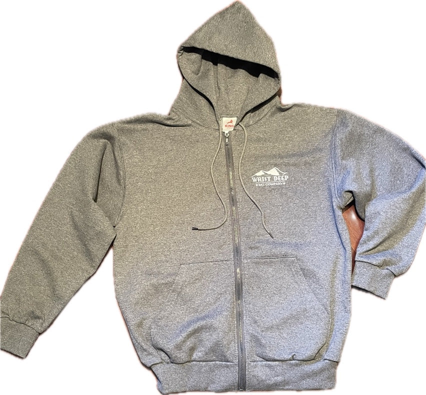 Medium Grey Women’s hoodie with white embroidered Waist Deep logo on left side.